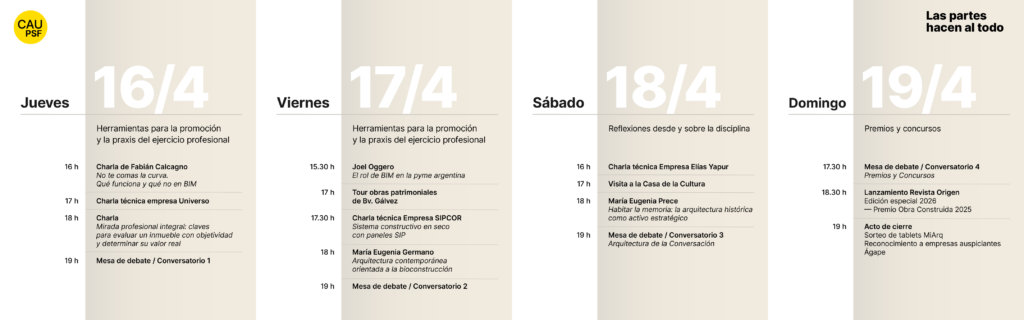 El programa se encuentra en construcción y continuará sumando propuestas en articulación con comisiones, distritos y empresas. En esta primera difusión, el CAUPSF comparte algunas de las actividades ya confirmadas, que se desarrollarán en su espacio dentro de la feria.